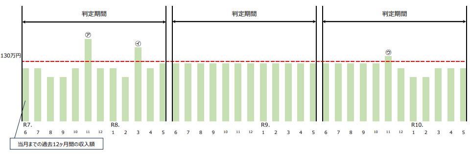 - ㋓令和8年7月に令和7年8月~令和8年7月までの12ヶ月間の収入合計が130万円を超えた ⇒ 連続2回目